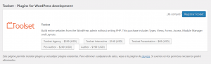 - Desde la sección My sites en https://toolset.com pulsar sobre el icono en forma de llave que se encuentra justo antes del nombre de dominio en cuestión. Esta acción llevará a la página de registro del plugin en la administración de _Wordpress_ del dominio